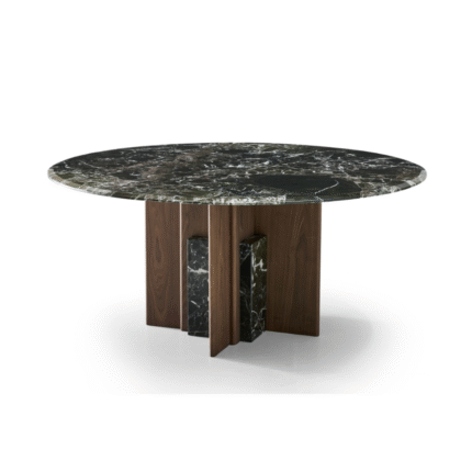 The Essenziale dining table features a sleek, round tabletop made of optional marble, offering a modern and elegant look. The base is a unique, tapered cylindrical shape with a smooth finish in a neutral tone, providing both stability and a stylish contrast to the dark top. This design blends contemporary aesthetics with functionality, making it a sophisticated centerpiece for any dining area.