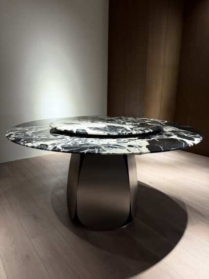 The Essenziale dining table features a sleek, round tabletop made of optional marble, offering a modern and elegant look. The base is a unique, tapered cylindrical shape with a smooth finish in a neutral tone, providing both stability and a stylish contrast to the dark top. This design blends contemporary aesthetics with functionality, making it a sophisticated centerpiece for any dining area.