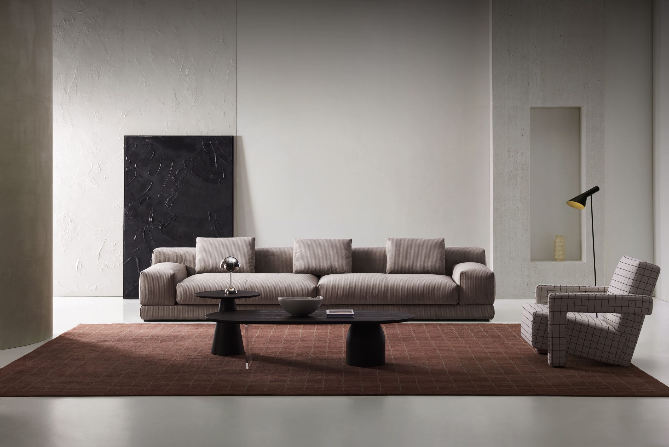 Its low-profile design and clean lines contribute to a modern aesthetic, making it a versatile piece for contemporary interiors. The rounded armrests add a touch of elegance and enhance the overall comfort.