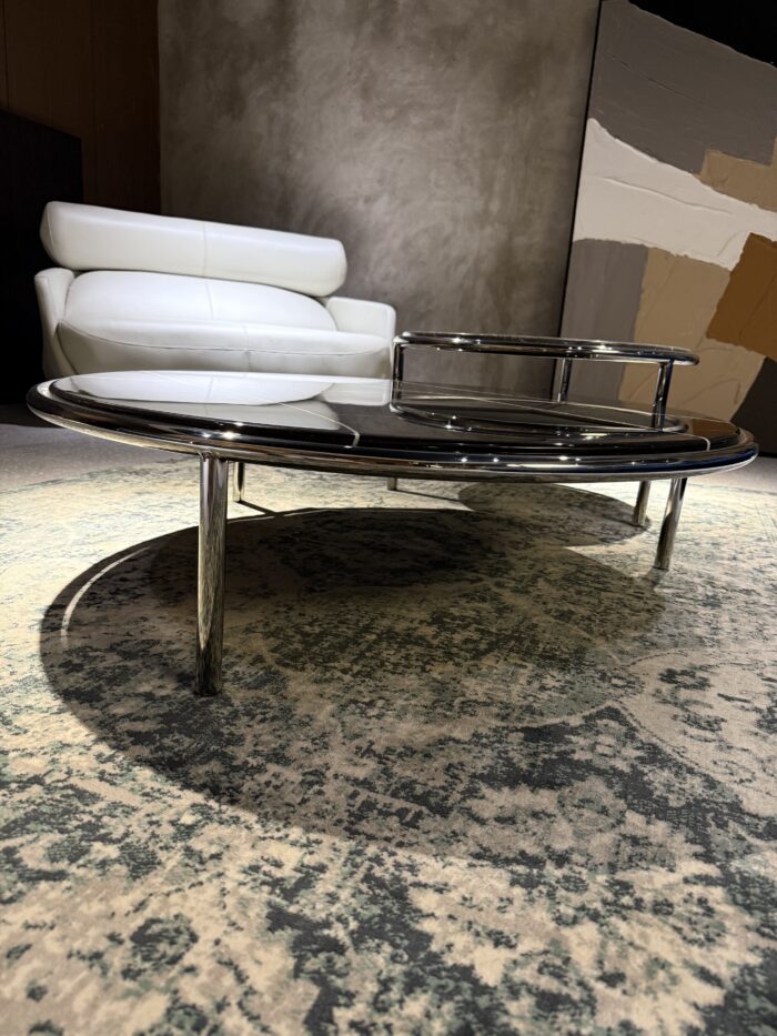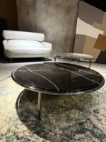 The Portico table features a chic and minimalist design with a round top made of Nero Marquina marble, highlighted by subtle white veining. The marble is encircled by a sleek metal frame, and the table is supported by slender stainless steel legs. This combination of luxurious marble and stainless steel frame creates a modern and elegant piece, perfect for sophisticated and contemporary interiors.