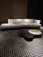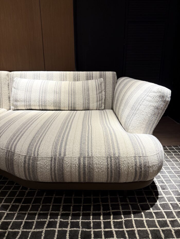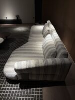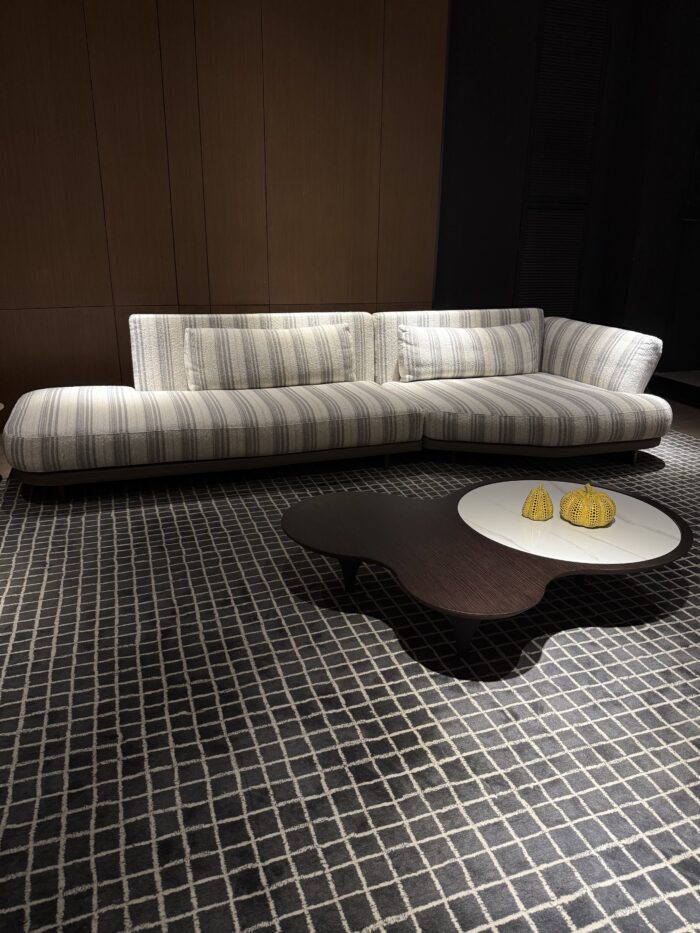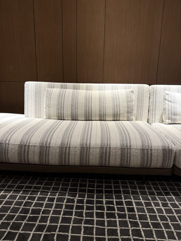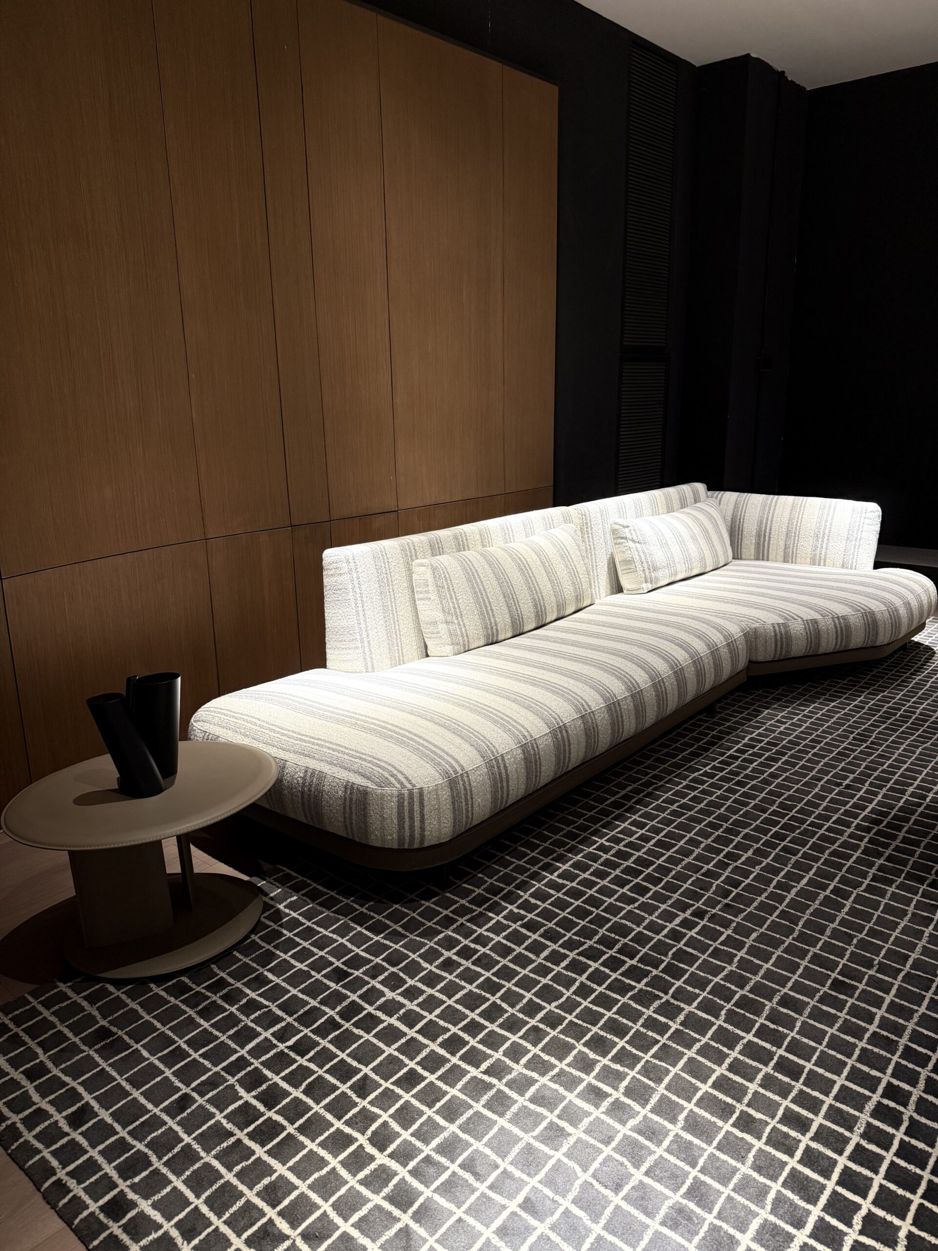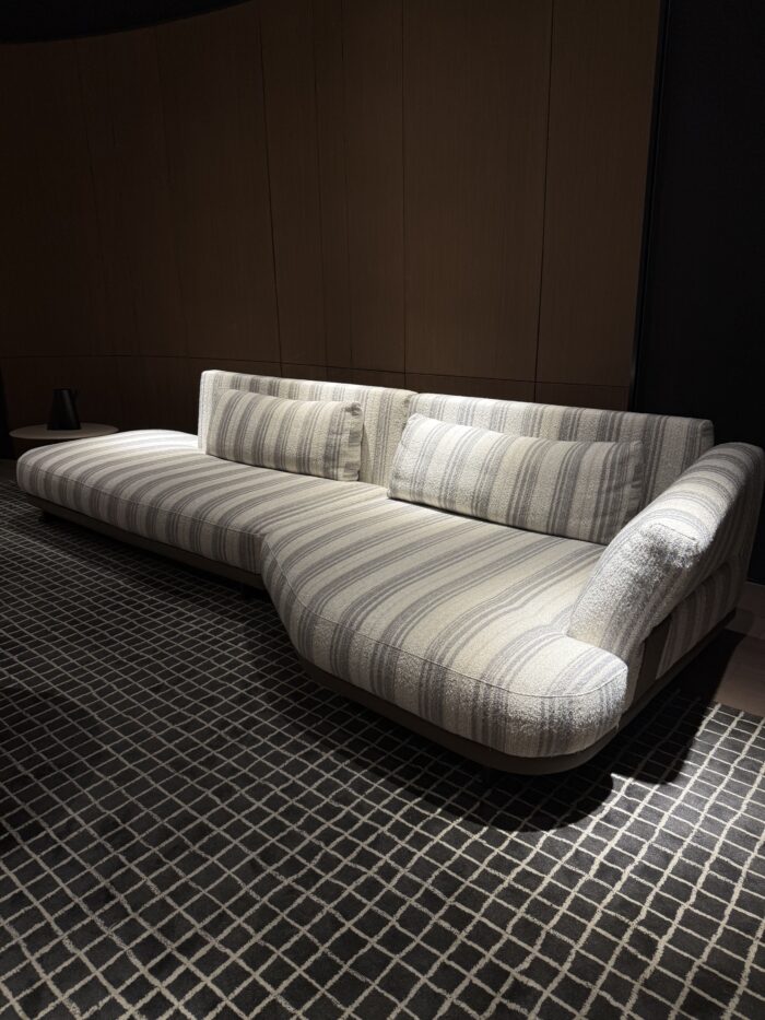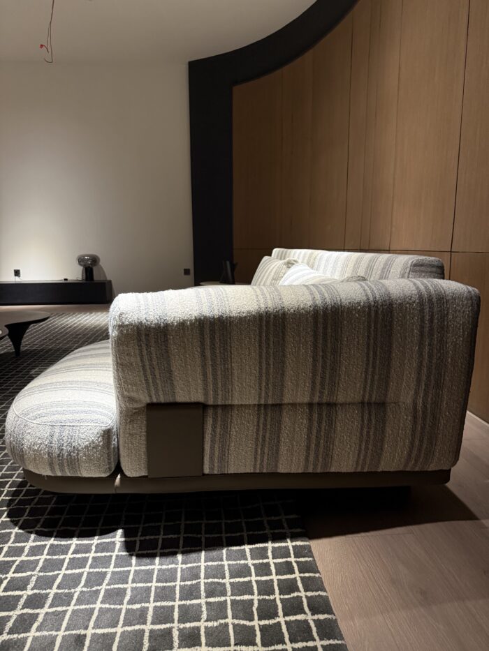 The Profondo sofa features a sleek and contemporary Italian design, perfect for modern living spaces. It has a low-profile, sectional layout with clean lines, providing a minimalist aesthetic.