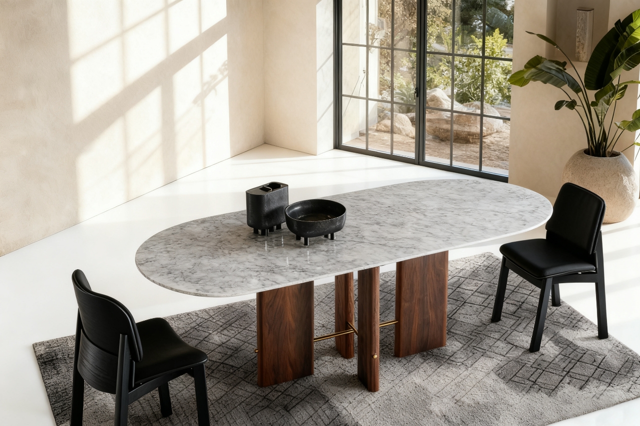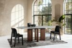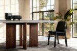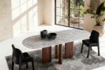 The Ristoro dining table features an elongated oval top made of optional marble or ceramic, providing a classic and elegant appearance. The base is composed of multiple vertical wooden panels with a warm, natural finish, connected by subtle stainless steel rods for added stability and style. The combination of luxurious top with the wooden base creates a harmonious blend of modern and traditional elements, making it a versatile and sophisticated addition to any dining space.