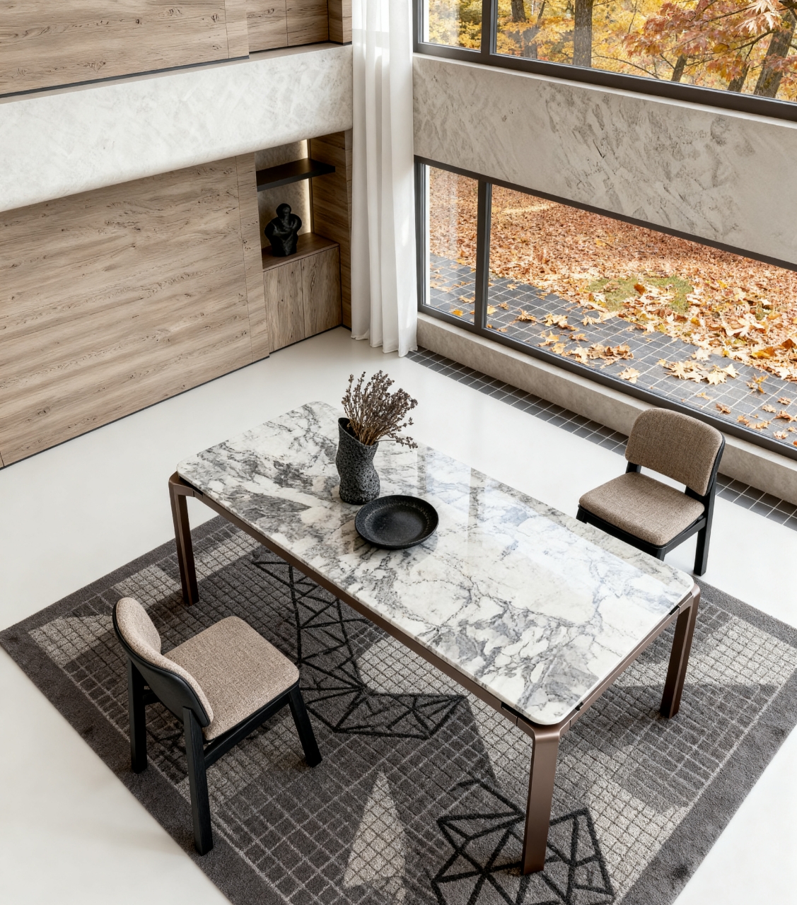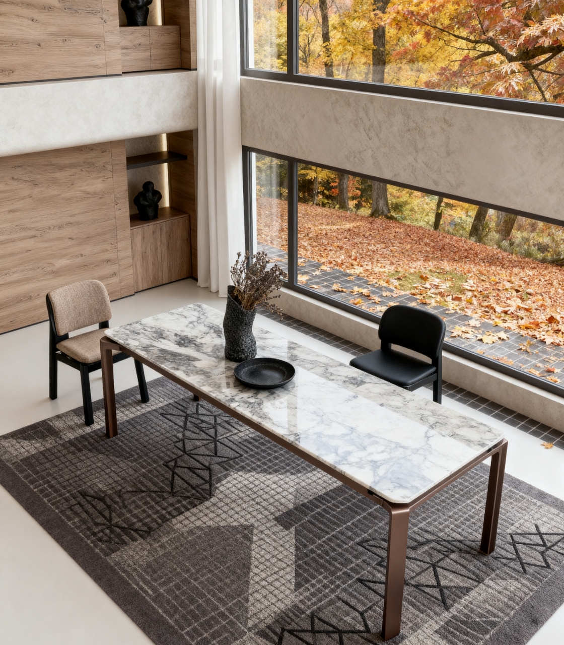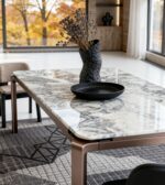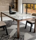 The Scorcio dining table features a rectangular top made of optional marble or ceramic, providing a clean and elegant look. The base consists of sleek, straight steel legs with a polished finish, adding a modern and minimalist touch. The combination of the marble top and steel legs creates a refined and sophisticated design, making this table a versatile addition to any dining area. Its simplicity and elegance make it suitable for various interior styles.