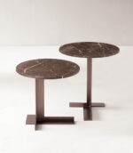 The Sentiero table features a sleek and minimalist design. It has an oval-shaped top made of Persian grey marble with subtle veining, giving it a refined and elegant look. The base is a metal column with a cross-shaped support at the bottom, finished in a matching brown tone. This design combines simplicity and sophistication, making it a versatile piece for various interior styles.