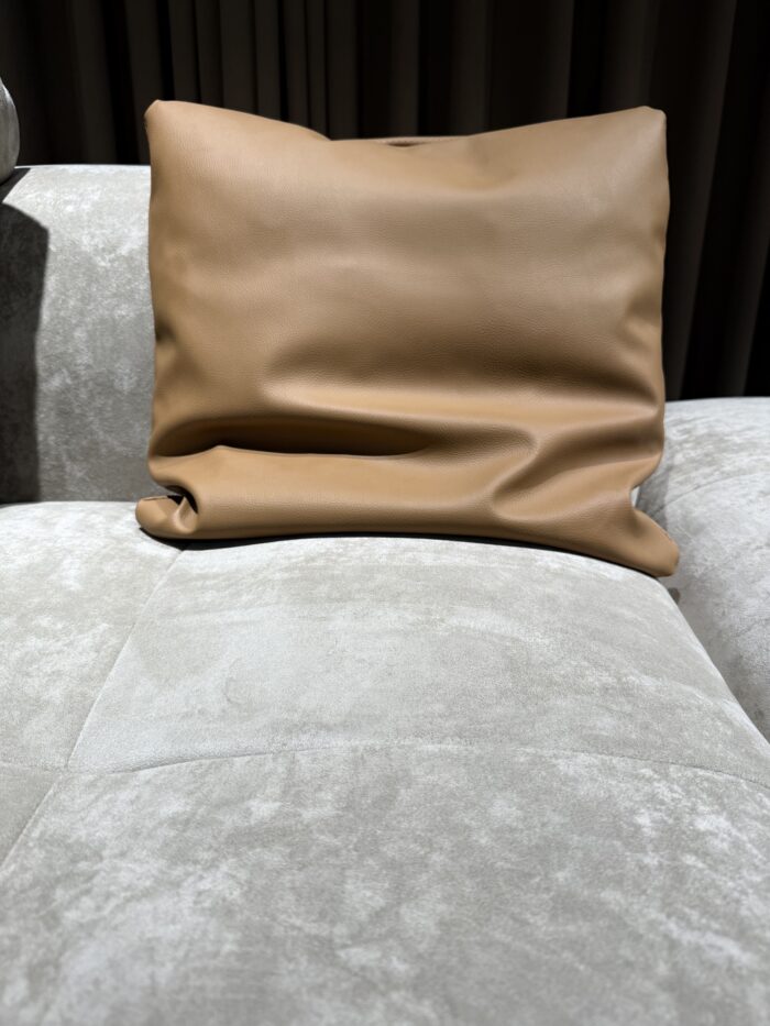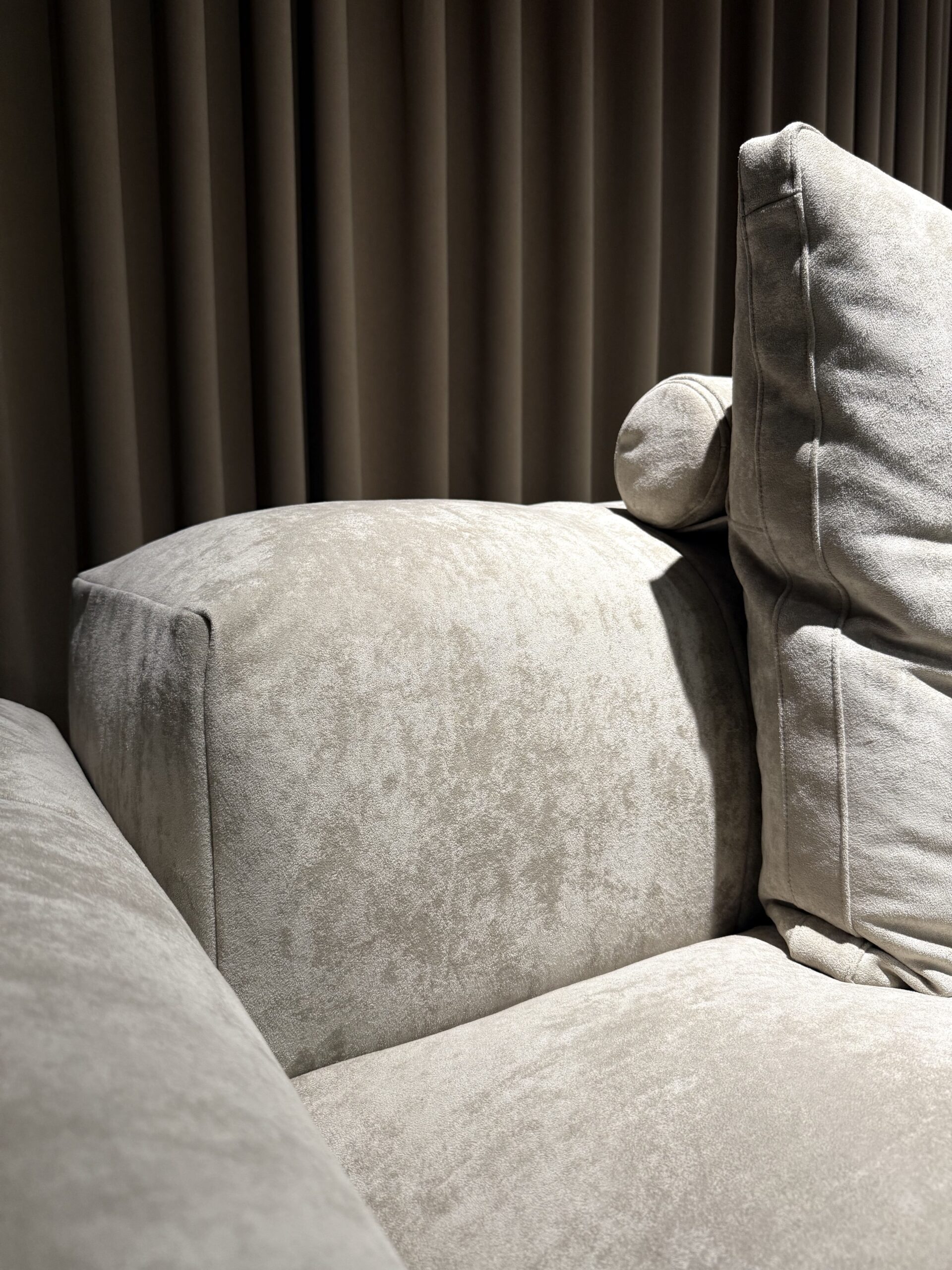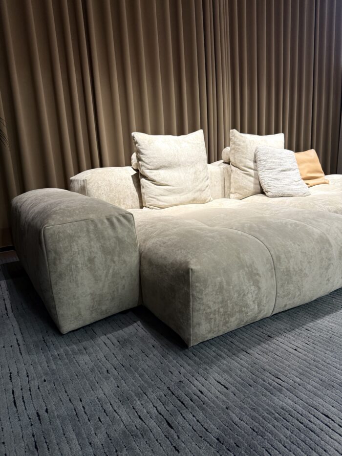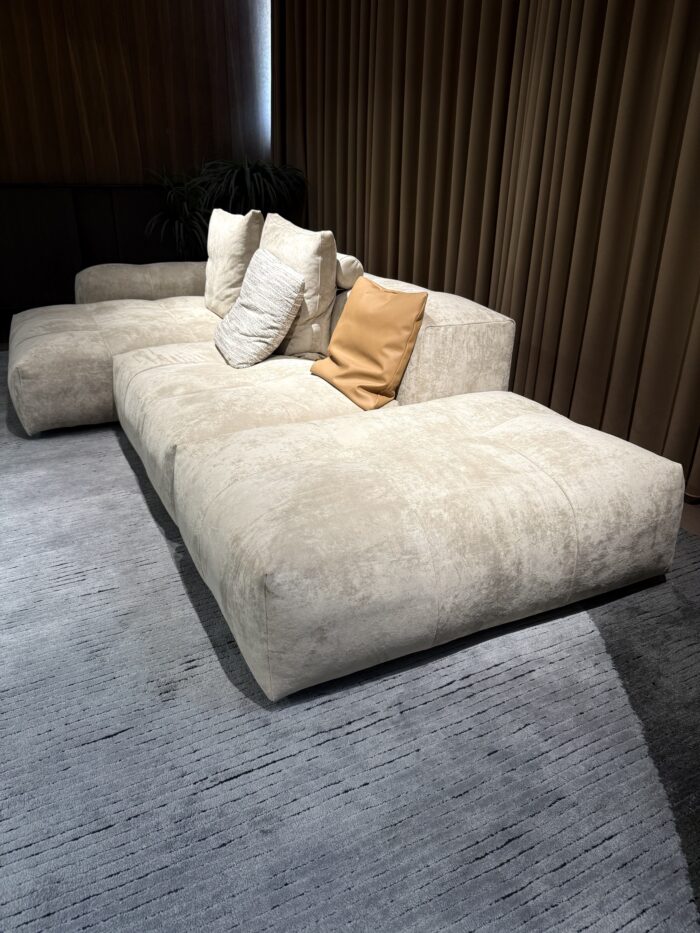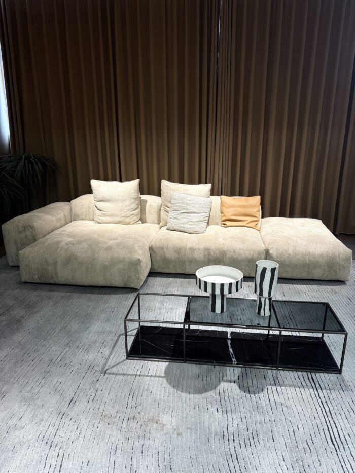 The modular sections can be rearranged to suit different layouts, offering flexibility in design. Accentuated with plush pillows, the sofa provides additional support and comfort. The low backrest and wide seating enhance its modern appeal, making it both functional and stylish.