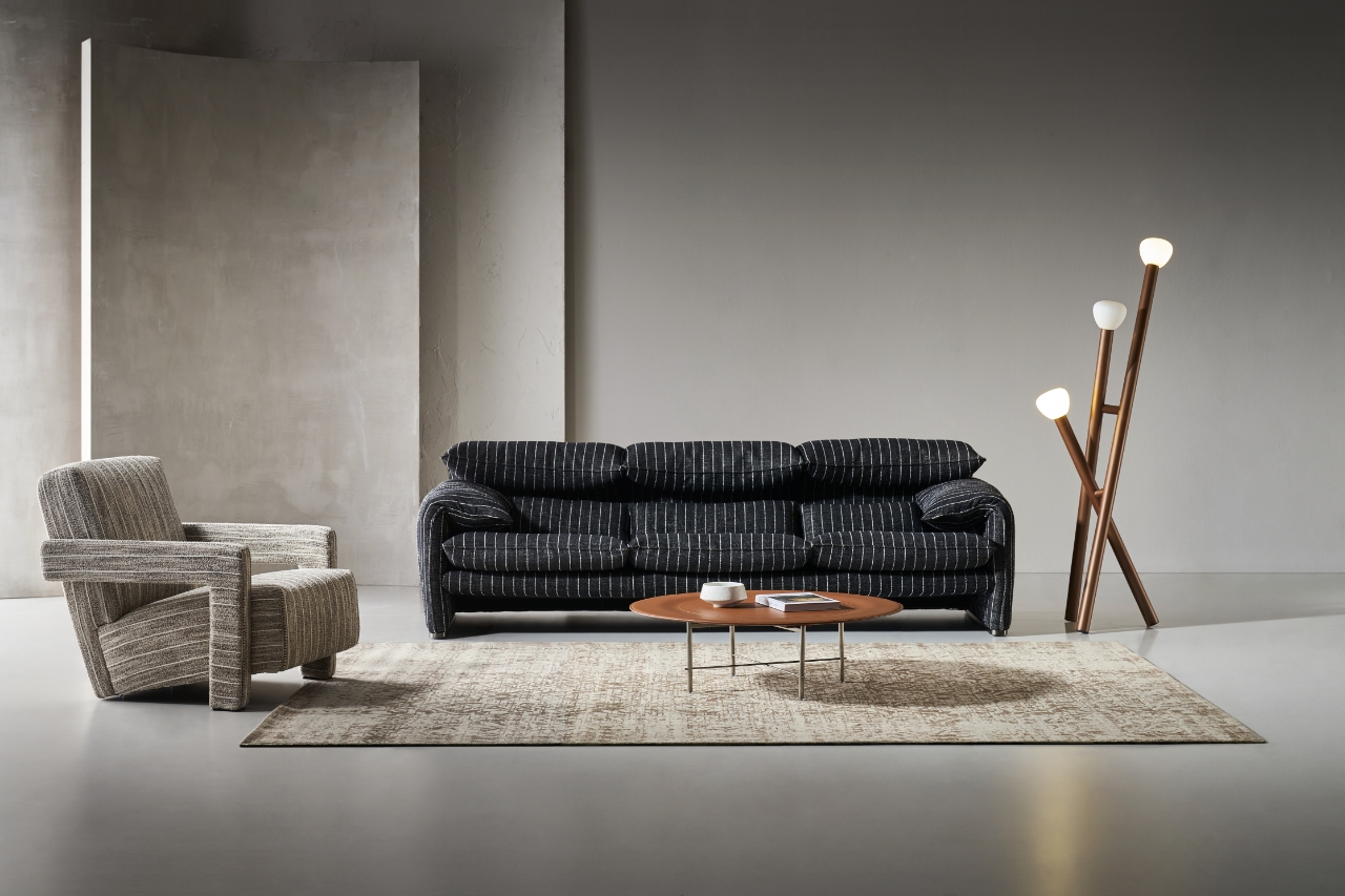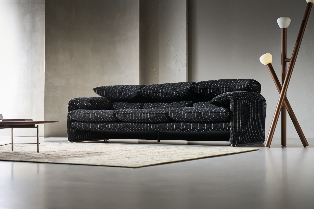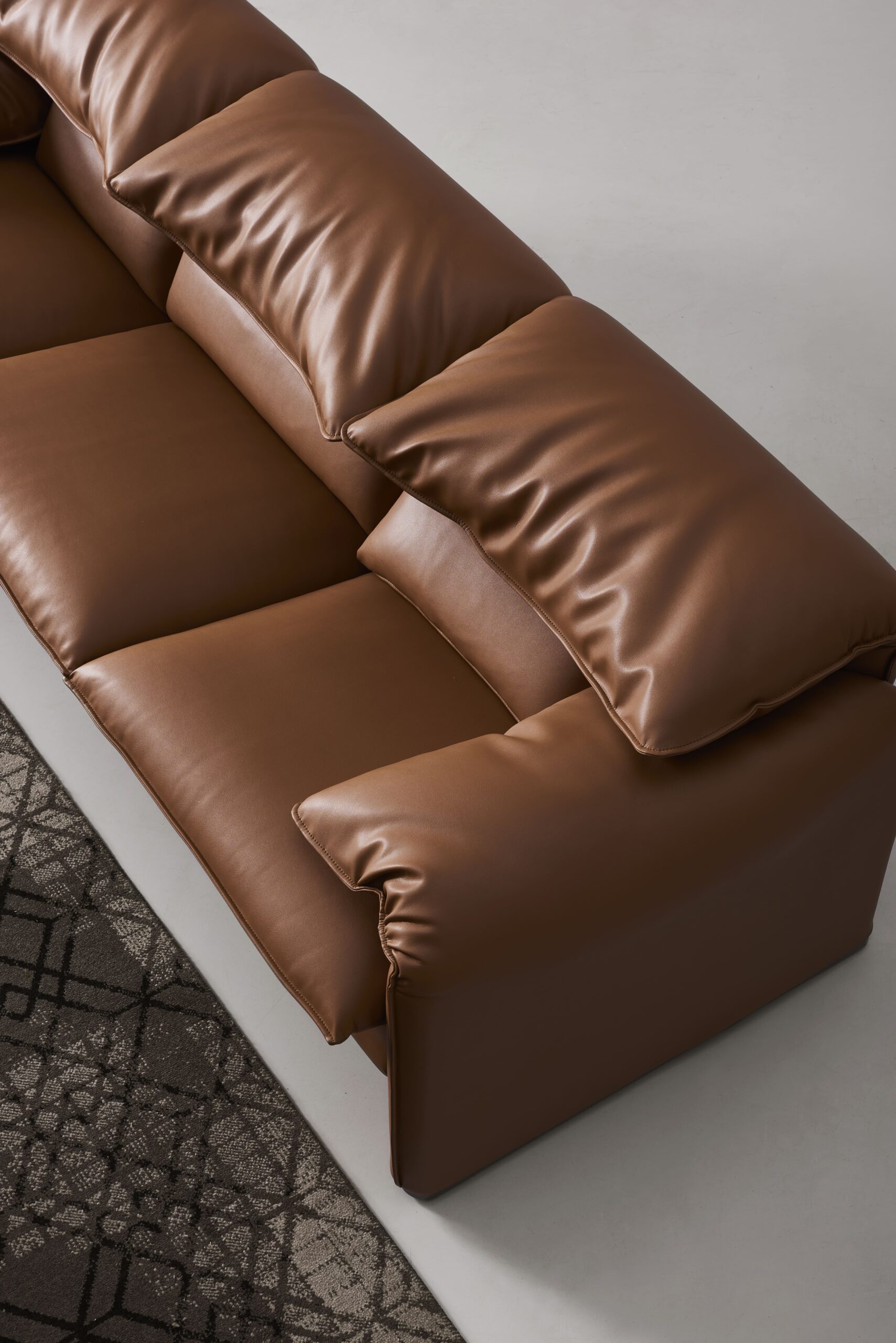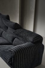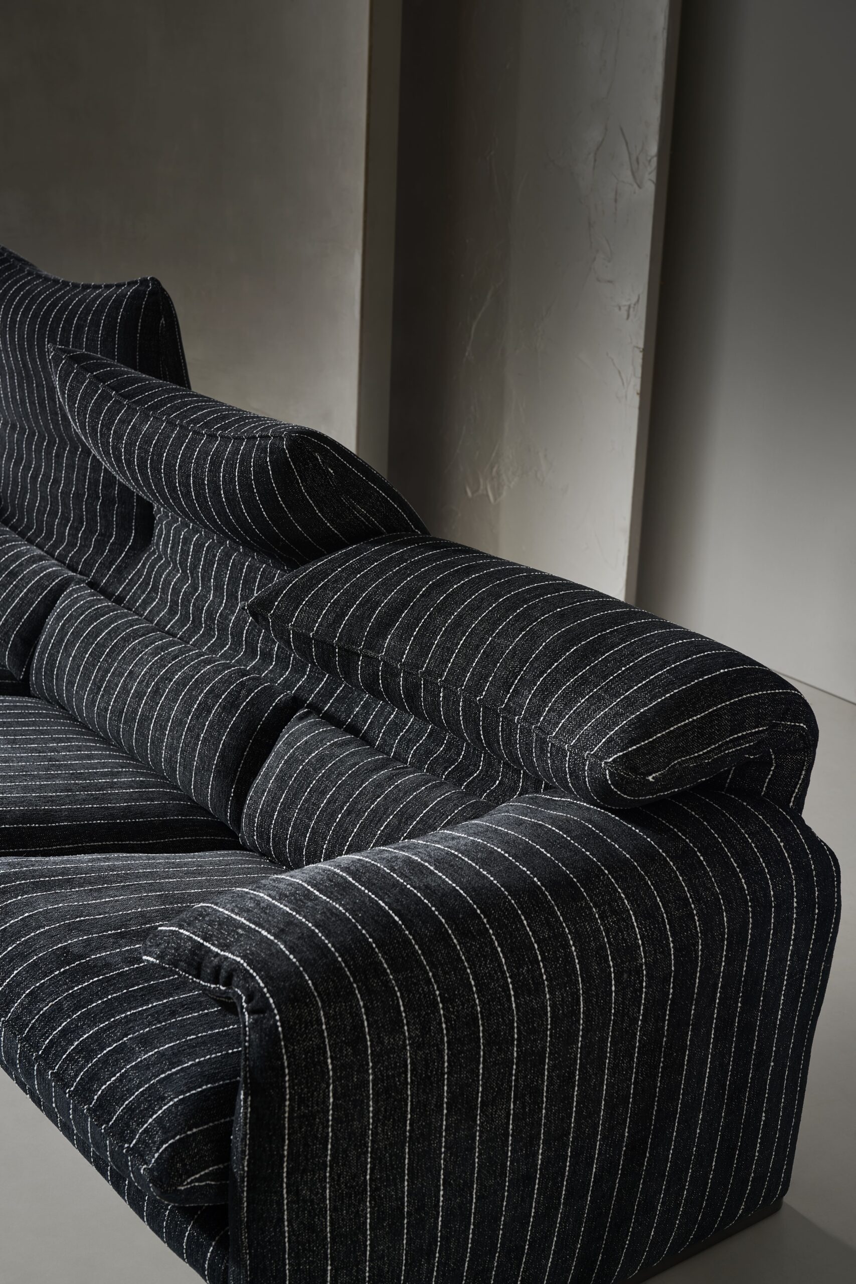 The Belvedere Sofa’s design includes a unique arrangement of cushions that drape over the back and armrests, creating a relaxed and informal look. The frame is sleek and minimal, with low-profile legs that give the sofa a modern edge. The overall aesthetic is both chic and comfortable.