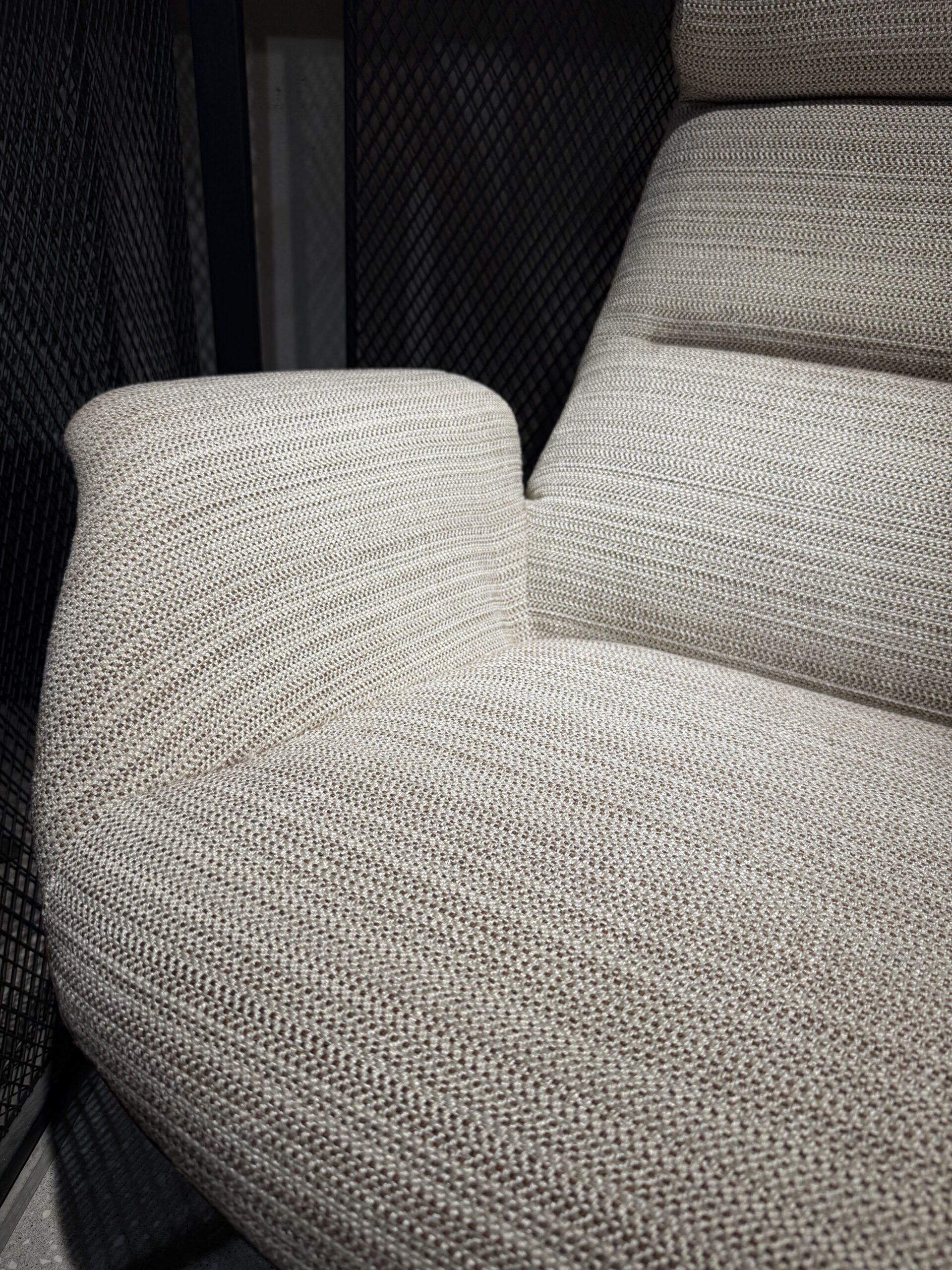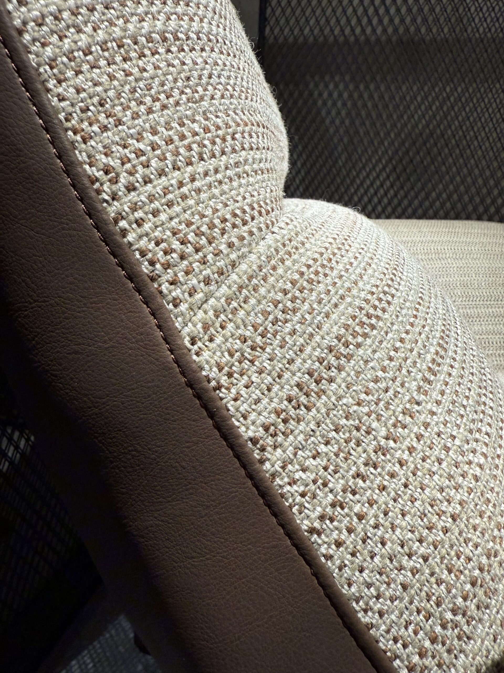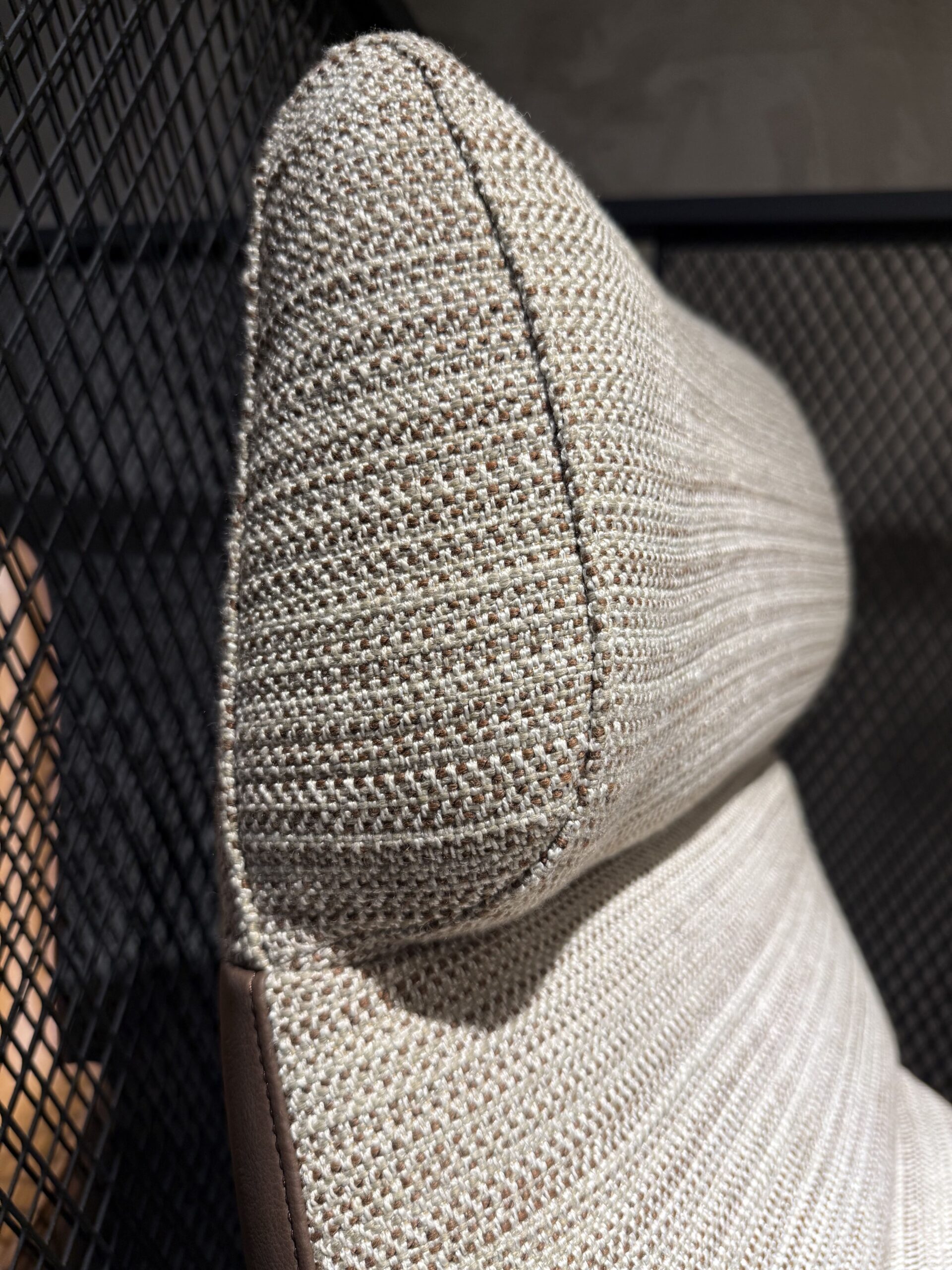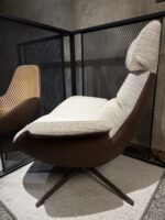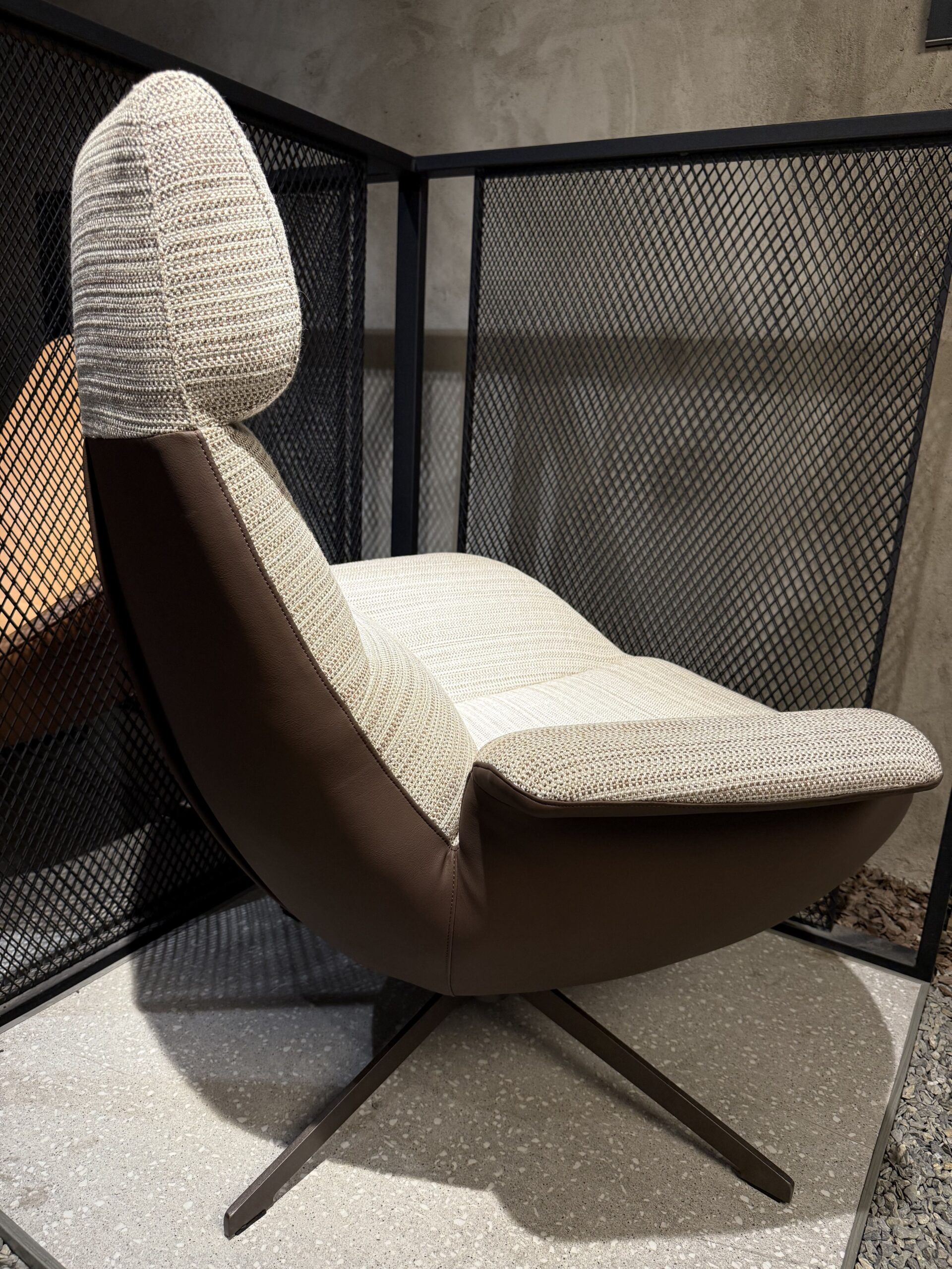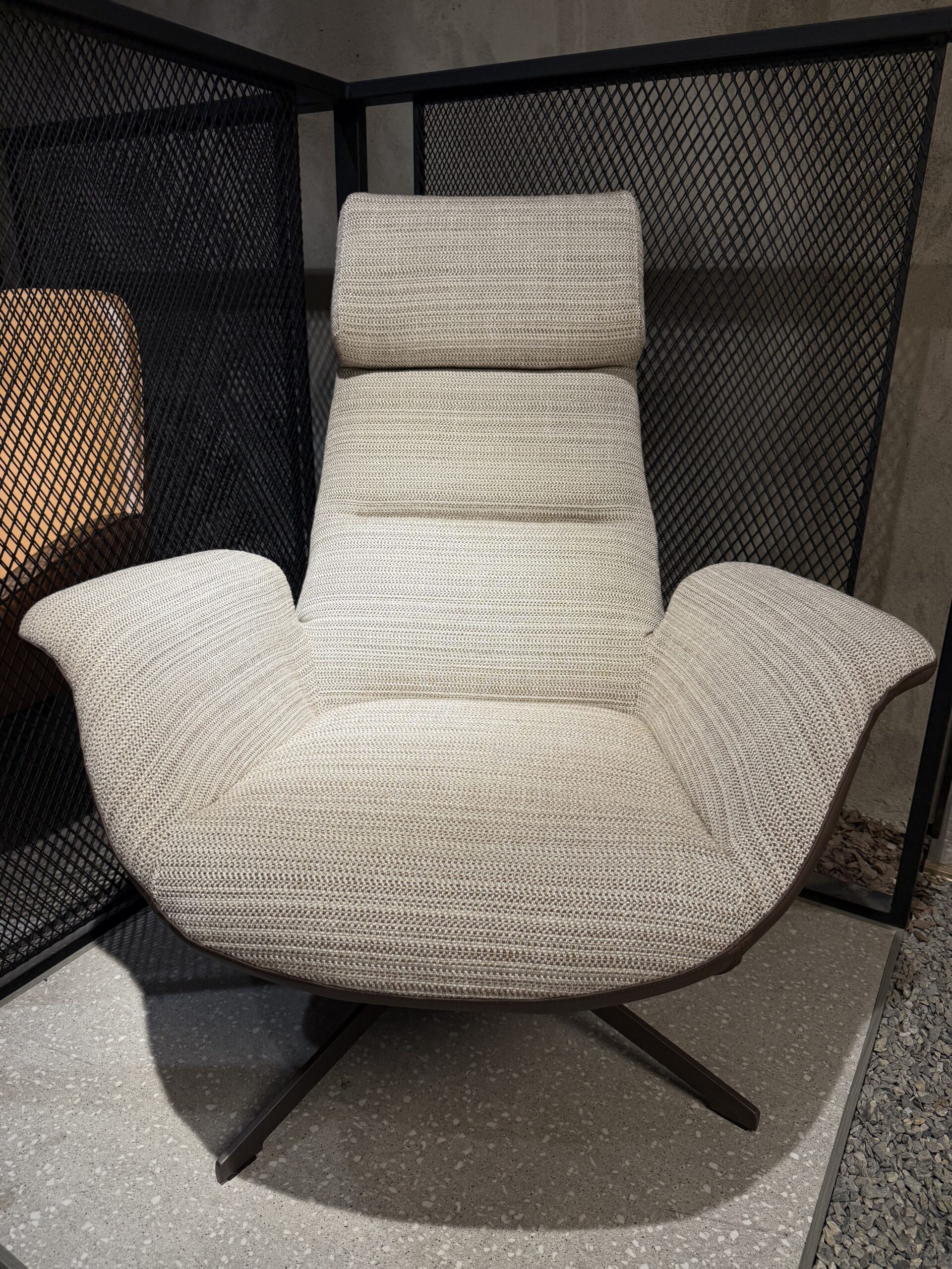 The Sorgente lounge chair features a sophisticated and modern design, perfect for contemporary spaces. Its high back and ergonomic shape provide excellent support and comfort, ideal for relaxation. The soft, textured fabric adds a touch of elegance and versatility. The chair is mounted on a sleek metal swivel base, allowing for easy movement and enhancing its functional appeal. This piece effortlessly combines style with comfort, making it a chic addition to both office and home environments.