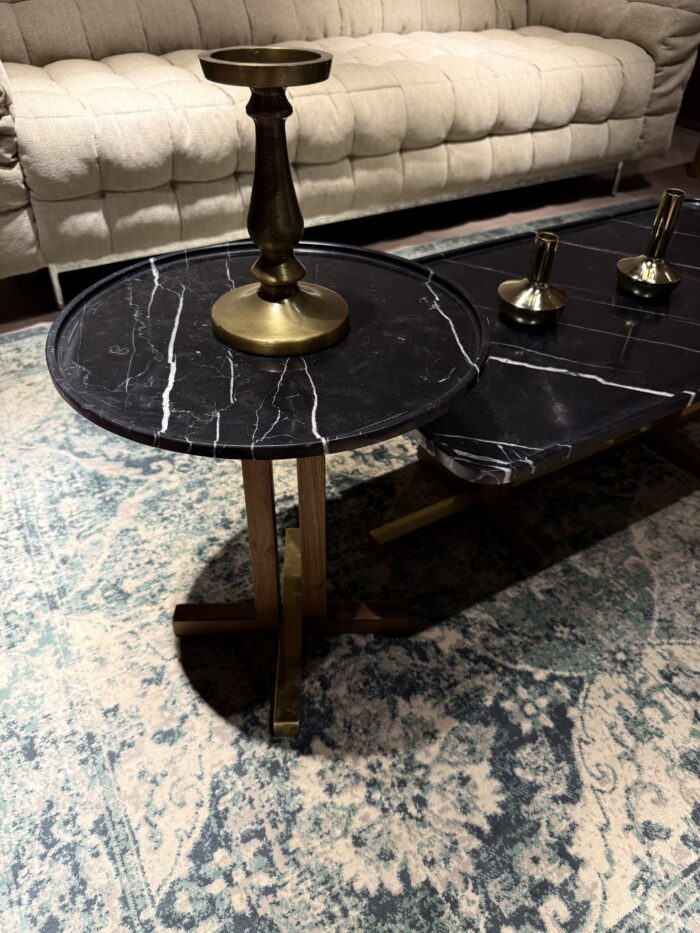 The Torcia S coffee table features a sophisticated and elegant design. It has round top made of Nero Marquina marble with white veining, offering a luxurious and timeless appeal. The base consists of intersecting stainless steel legs, combining black and gold finishes for a striking contrast. This combination of materials and colors creates a chic and modern aesthetic, perfect for upscale living spaces.