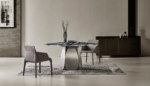 The Trama dining table features a round top made of optional marble or ceramic, adding a luxurious and dramatic flair. The base is crafted from sleek, curved stainless steel panels arranged in a petal-like formation, providing a modern and artistic touch. The metallic finish of the base contrasts beautifully with the marble top, making this table a bold and elegant centerpiece for any dining space. The combination of materials and design creates a sophisticated and unique look.