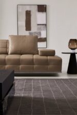 The Vento sectional sofa features a striking combination of taupe and black leather, creating a modern and sophisticated look. The modular design allows for versatile configurations, making it adaptable to various room layouts.